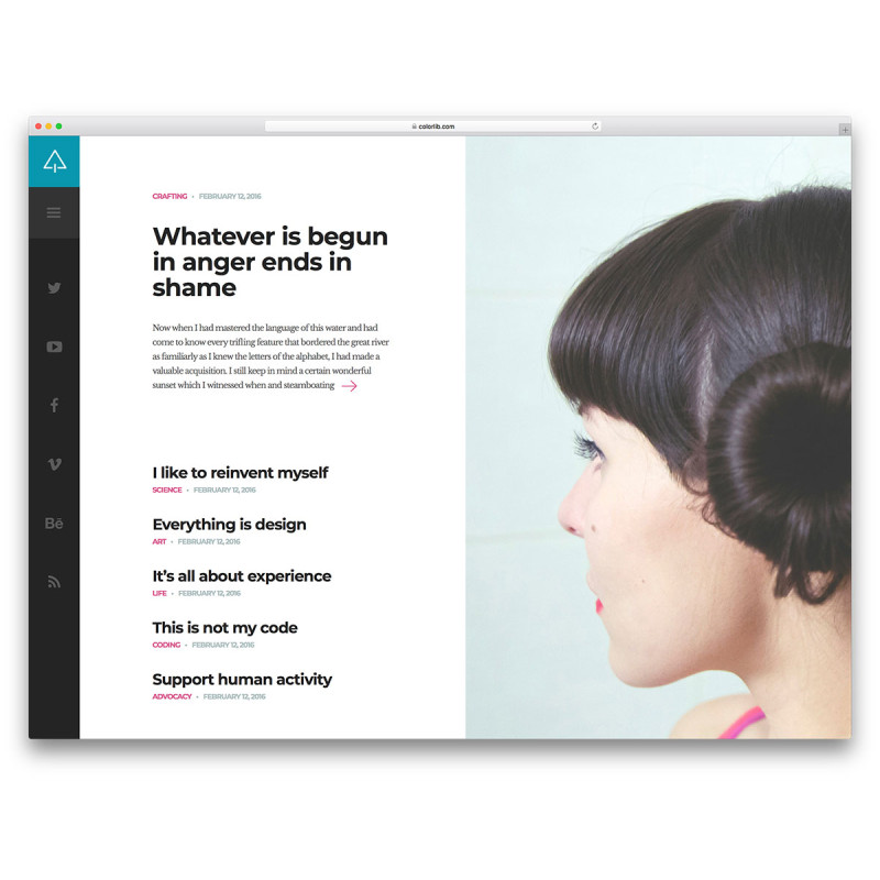 Еще одна уникальная особенность бесплатного шаблона блога Suppablog - единственный в своем роде hover-эффект, эффект при наведении курсора. Когда вы наводите курсор мыши на нужный контент, он размывает все остальное и выделяет только тот, который вам интересен при чтении. Приятно, не так ли? С левой стороны Suppablog находятся социальные иконки и необычное меню. Писатели и блоггеры, обращаемся к вам, вы только что нашли оригинальный шаблон, который заставит вас легко выделиться из толпы. Произведите колоссальное впечатления на всех пользователей вашего ресурса. С минимализмом и креативностью вы получите постоянных посетителей навсегда. Все, что вам нужно сделать, это добавить свой контент, а успех блога не заставит себя ждать.