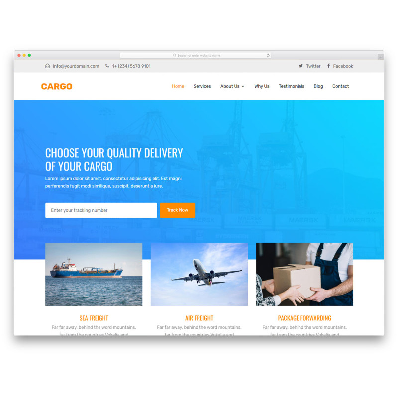 Cargo - это яркий и современный бесплатный шаблон сайта компаний, занимающихся грузоперевозками. Благодаря удивительному веб-дизайну теперь вы можете создать бизнес-сайт намного быстрее. Одно можно сказать наверняка: у вас есть полномасштабный дизайн, и все готово к запуску. Некоторые из особенностей Cargo-это липкая навигация, одностраничная структура сайта, загрузка контента на прокрутке и таблицы цен. Анимированная статистика, слайдер отзывов и функциональная контактная форма - это всего лишь несколько дополнительных плюсов, которые вам очень пригодятся. Окажите влияние на отрасль грузоперевозок с помощью бесплатного шаблона сайта Cargo.