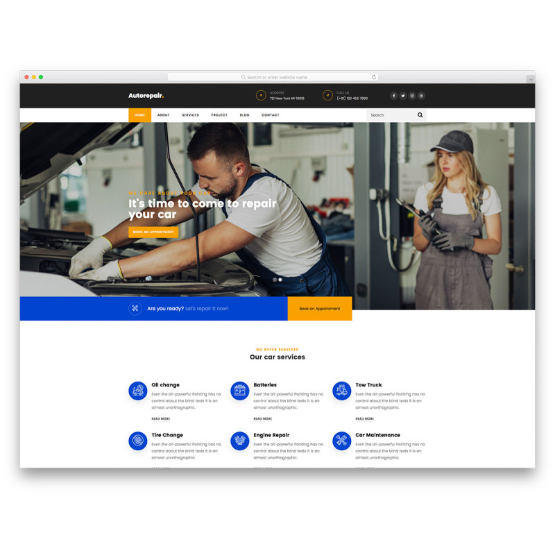 Auto Repair-это профессиональный и первоклассный бесплатный шаблон сайта по ремонту автомобилей, который работает для всех видов автосервисов и предприятий. Благодаря чистому и яркому дизайну Auto Repair быстро подстраивается под различные цели. В комплекте функций вы получаете слайдер, призыв к действию, иконки социальных сетей, анимированную статистику, бесплатную консультационную форму и ценовые планы. Существует также полноценная страница контактов. В рамках последнего вы также найдете интегрированные Карты Google.