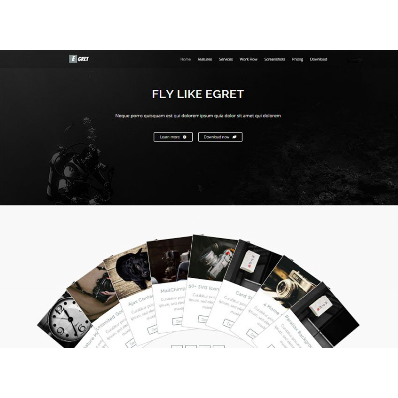 Egret - простой одностраничный шаблон, который подойдет для портфолио, страницы услуг компании, для сайта фотографа или дизайнера. Он имеет различные цветовые схемы, поддержку почтовых отправлений, контактную форму ajax и т. д. У шаблоны есть эффектная анимация и современный дизайн, он бесплатный, гибкий и адаптивный, будет хорошо смотреться на любых устройствах.