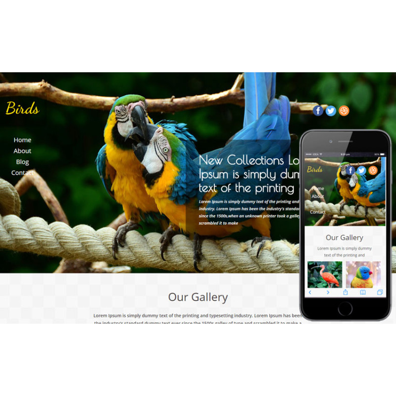 Birds - очень яркий и красивый шаблон, который отлично подойдет для сайта о животных, для сайта контактного или обычного зоопарка, для блога об уходе за домашними и дикими животными или для сайта ветеринарной клиники или частного айболита. Шаблон выглядит броско и современно, яркие изображения придают ему особый шарм, если вы хотите их заменить, то выбирайте подобные, красочные и сочные картинки.