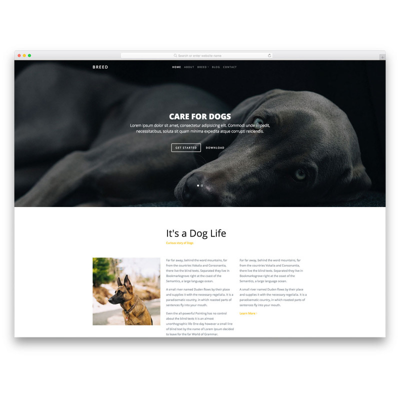 Из коробки, Breed приходит как бесплатный шаблон для собаководства. Однако, благодаря простоте использования и гибкости, вы можете быстро и без особых усилий адаптировать Breed к другим потребностям сайта о животных. Пусть это будет коневодство, кошки, сайт ветеринарнойклиники, вы должны знать, что шаблон Breed здесь, чтобы заботиться о ваших потребностях и реализовать ваш проект. Веб-дизайн шаблона прост и упрощен, а функции ценны и оригинальны.