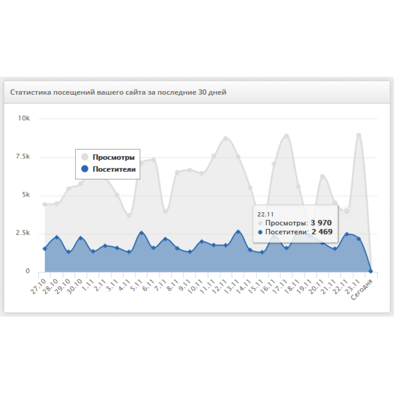 Статистика ведется за последние 30 дней, что помогает вам без лишних сервисов прямо на вашем сайте видеть общую картинку посещаемости вашего сайта.