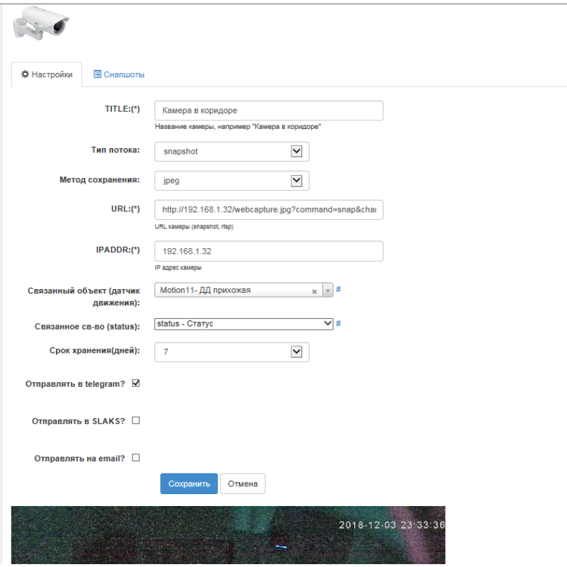 Сохранение снапшотов и видео с камеры по датчику движения. Отправка в телеграмм.