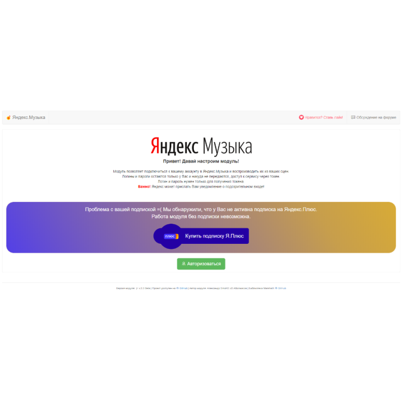Модуль позволяет подключится к своему аккаунту в Яндекс.Музыке и слушать треки.