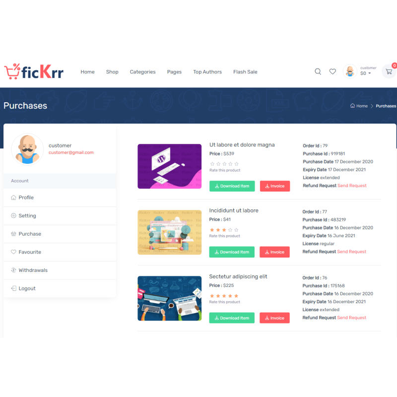 Существует множество мощных функций для включения / отключения подписки, ролей пользователей, флеш-сделок, блогов, платежных шлюзов, входа в систему и совместного использования в социальных сетях, многоязычности и рекапчи, импорта / экспорта продукта, создания счетов-фактур в формате pdf, реферальных доходов, эксклюзивных и неисключительных комиссионных доходов