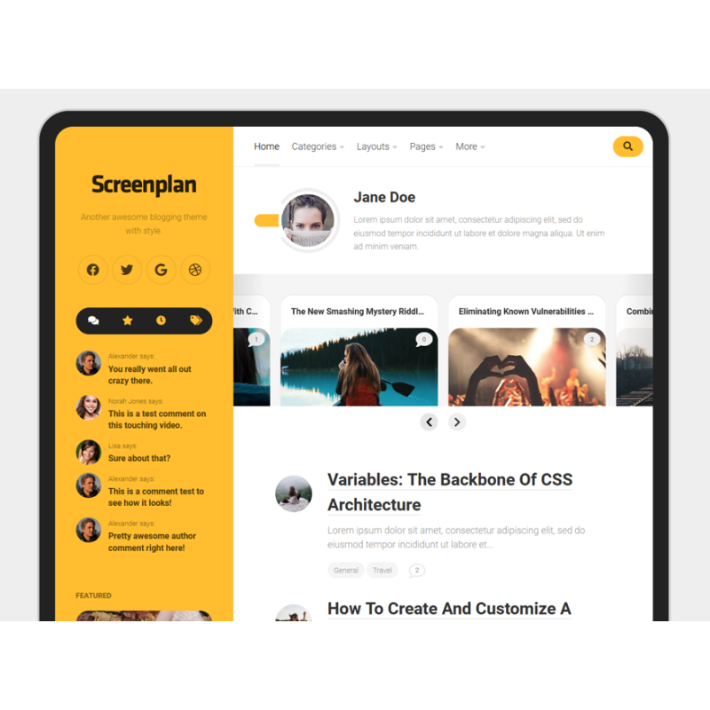 Screenplan — гибкая тема блога с множеством опций. Тема оптимизирована для всех устройств. Вы можете выбрать цвета акцента, установить боковую панель слева или справа и выбрать максимальную ширину сайта.