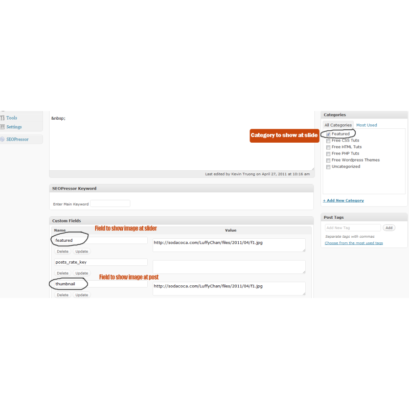 Для вставки миниатюр и для работы слайдера к каждой записи нужно добавлять произвольное поле thumbnail и указать адрес картинки. Смотрите доп фото.