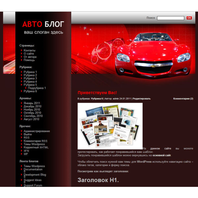 Ваш блог посвящен автомобильной тематике. Логично, если в его оформлении будут фото машин. Спорткар от Chevrolet красного цвета будет отлично смотреться в шапке вашего блога. Цвет машины на фото вверху страницы перекликается с красно-бордовым оформлением страницы. Белый цвет текста на темном фоне и строка поиска на серебристой полосе придадут блогу стильный и элегантный вид. Шаблон для удобства пользователя имеет структуру с двумя столбцами. Тема для WordPress под названием Car распространяется бесплатно.