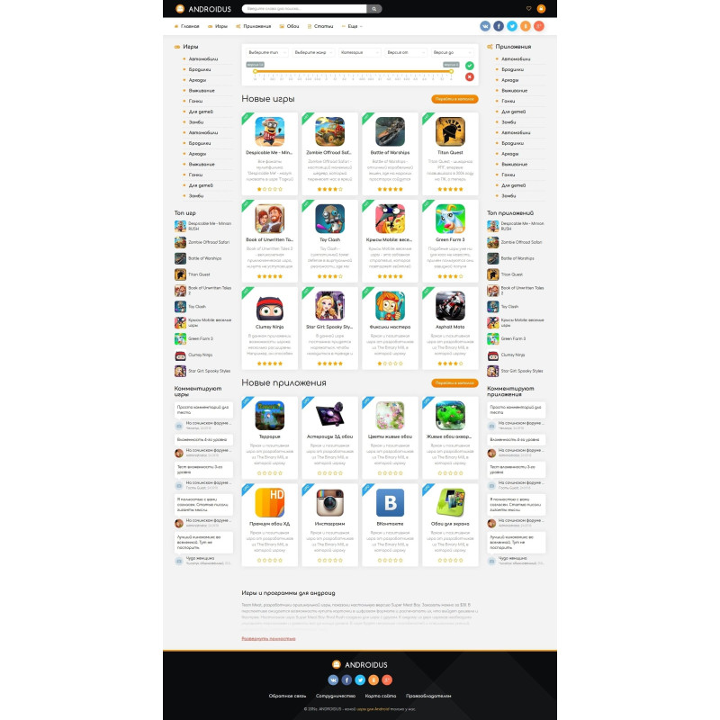 Androidus Warm - шаблон для сайтов android тематики для скачивания игр и приложений, выполненный в классической и удобной структуре в 3 колонки. Структура шаблона позволяет разместить меню как в левой, так и в правой колонке, а так же имеется верхнее выпадающее меню. На мобильных устройствах всё меню показывается нажатием одной кнопки. Также встроено готовое оформление под модуль фильтра. Предусмотрена и возможность вывода сео-описания сайта как на главной, так и в категориях. Для оценки приложений можно использовать рейтинг 5 звёзд, либо рейтинг с раздельными лайками/дизлайками. Данный android шаблон для DLE полностью адаптивен и прекрасно отображается на различных мобильных устройствах.