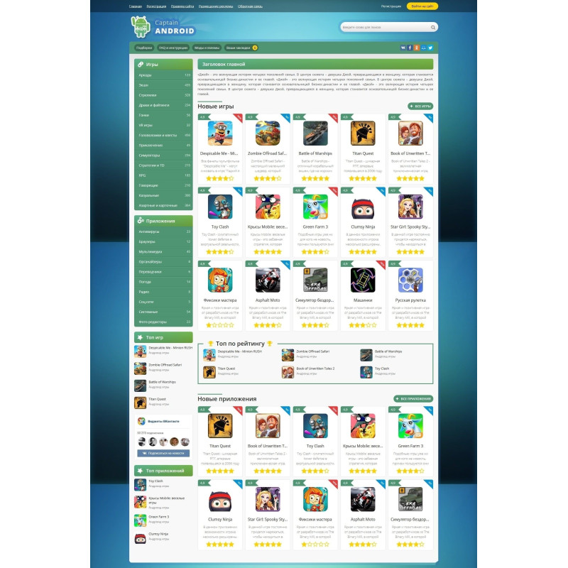 Captain Android - замечательный android шаблон для DLE для создания сайтов с каталогом бесплатных игр и приложений. Структурно шаблон состоит из 2-х колонок. В левой колонке расположено меню с категориями с автоматическим подсчетом количества игр в них. Помимо меню с категориями имеются 2 дополнительных верхних меню.