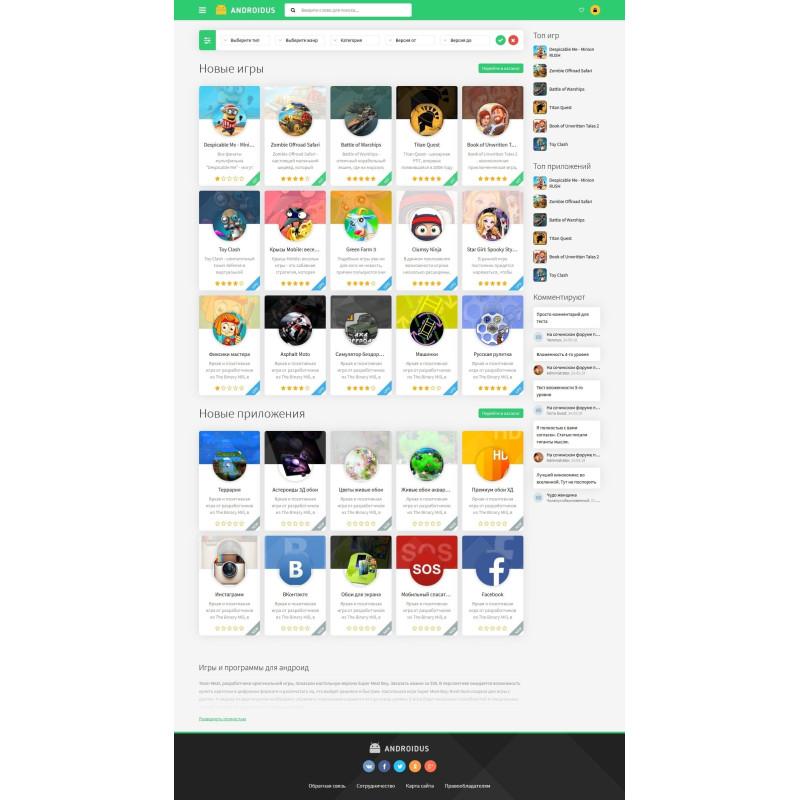 Androidus Green - симпатичный android шаблон для DLE в светло-зеленом исполнении с зелеными. Шаблон имеет удобную структуру и прекрасно подойдет для сайтов с играми и приложениями для андроид. Меню с категориями скрыто под кнопкой в верхнем баре, при нажатии на которую слева появляется блок с выдвижным меню. Сам же верхний бар фиксируется наверху при скроллинге, благодаря чему меню, поиск и личный кабинет в постоянной доступности. Также встроено готовое оформление под модуль фильтра. Предусмотрена и возможность вывода сео-описания сайта как на главной, так и в категориях. Для оценки приложений можно использовать рейтинг 5 звёзд, либо рейтинг с раздельными лайками/дизлайками. Интересно оформлен фон в кратких новостях, который накладывается в зависимости от цвета картинки, так, если на картинке больше зеленого, то фон зеленый, синего - синий. Данный android шаблон для DLE полностью адаптивен и прекрасно отображается на различных мобильных устройствах.