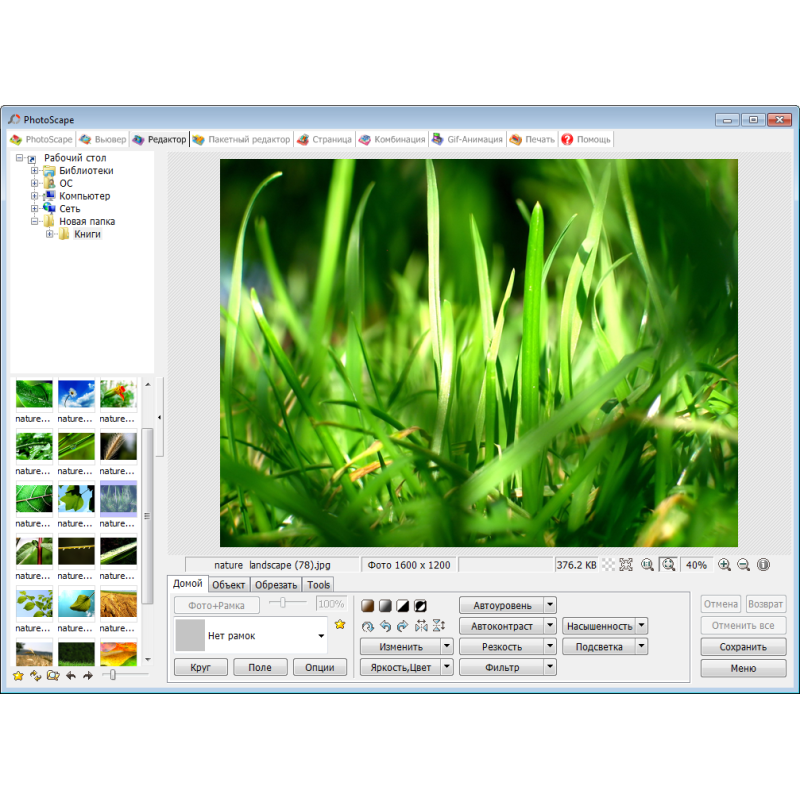 Возможности этого графического редактора позволяют полноценно обрабатывать фотографии и картинки. В частности, вы сможете обрезать рисунки, менять фон, делать два слоя, применять различные фильтры и ретушь, а также использовать немаленький набор инструментов. С их помощью можно подрисовывать или затирать, выставлять яркость, насыщенность, контраст, а также накладывать печатные символы на изображение. В числе дополнительных опций — создание скриншотов, GIF-анимации и слайд-шоу. Также программа способна осуществлять конвертацию файлов в формате RAW. Уже ради этого стоит скачать Photoscape бесплатно. Русская версия представлена на этой странице. Мы же рассмотрим этот продукт подробнее. Чтобы не запутаться во всех возможностях и быстро найти нужную функцию, разработчики ввели разделы на панели управления Photoscape. Самые объемные из них – «Редактор» и «Пакетный редактор». В первом разделе разрешается вносить изменения в размеры и формы изображений, выбирать для них контуры и рамки, а еще менять цвета и оттенки. Также здесь находятся такие инструменты как фильтр, автоматический контраст и уровень, нейтрализация «эффекта красноглазого вампира». В числе других возможностей можно воспользоваться такими как «картинка в картинке», обрезание, вставка текстового фрагмента.