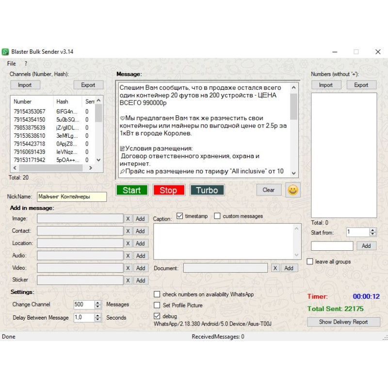 Программа  для рассылки сообщений Ватсап Blaster Bulk Sender по номерам.